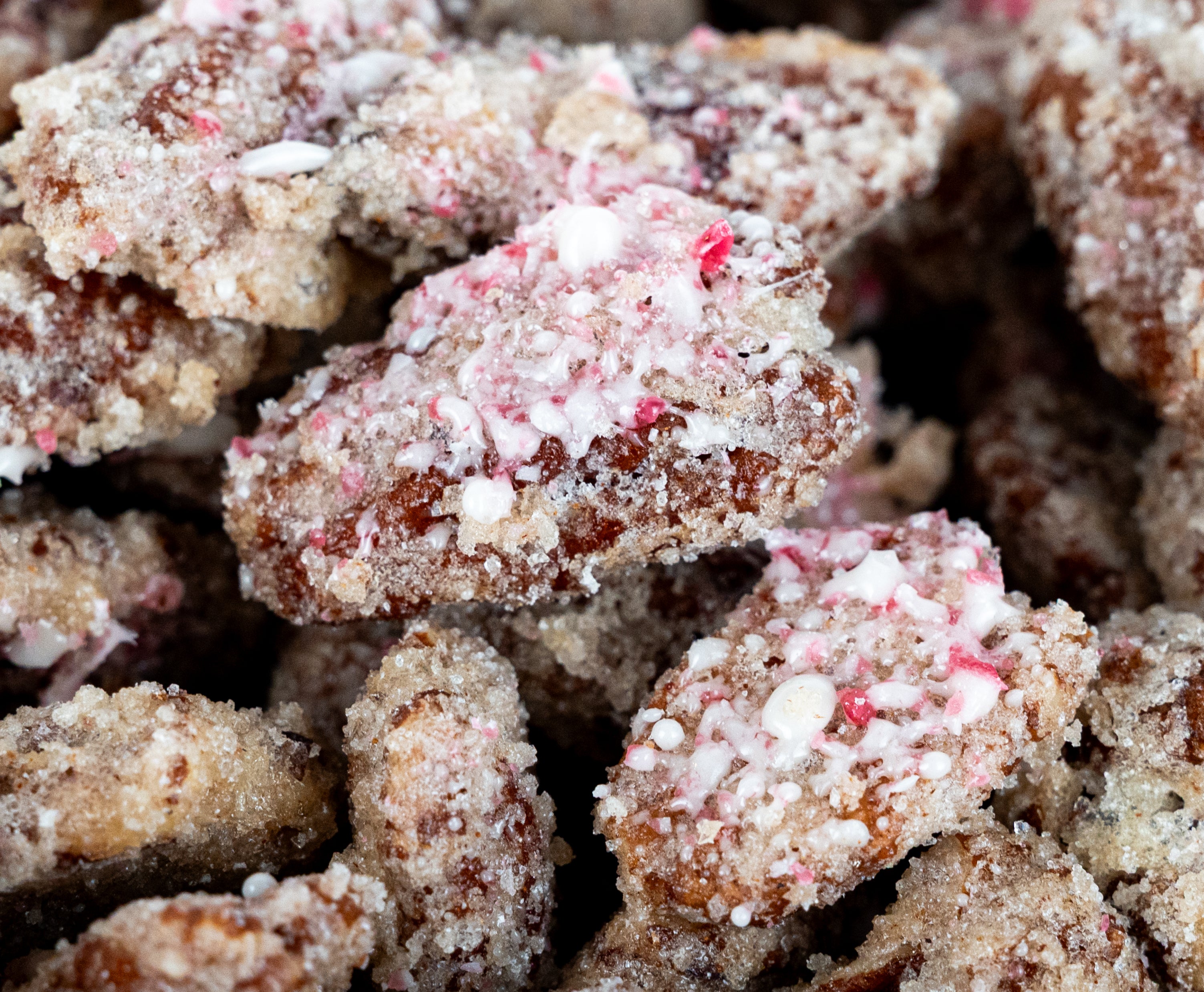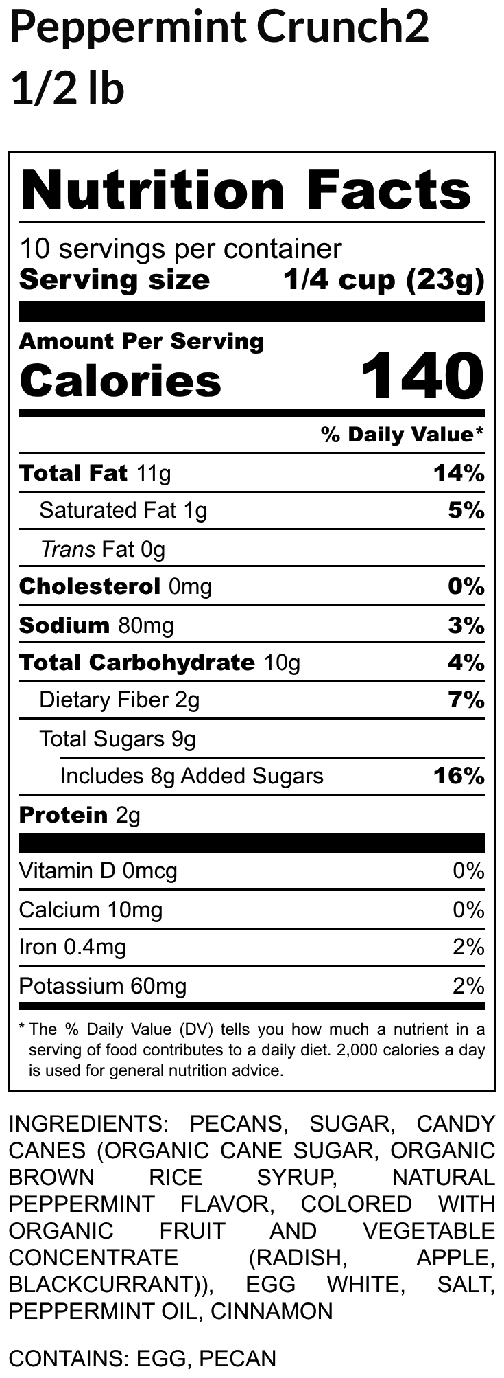 Ingredients: Pecans, Sugar, Candy Canes (Organic cane sugar, organic brown rice syrup, natural peppermint flavor, colored with organic fruit and vegetable concentrate (radish, Apple, blackcurrant)), Egg White, Salt, Peppermint oil, Cinnamon, Nutmeg